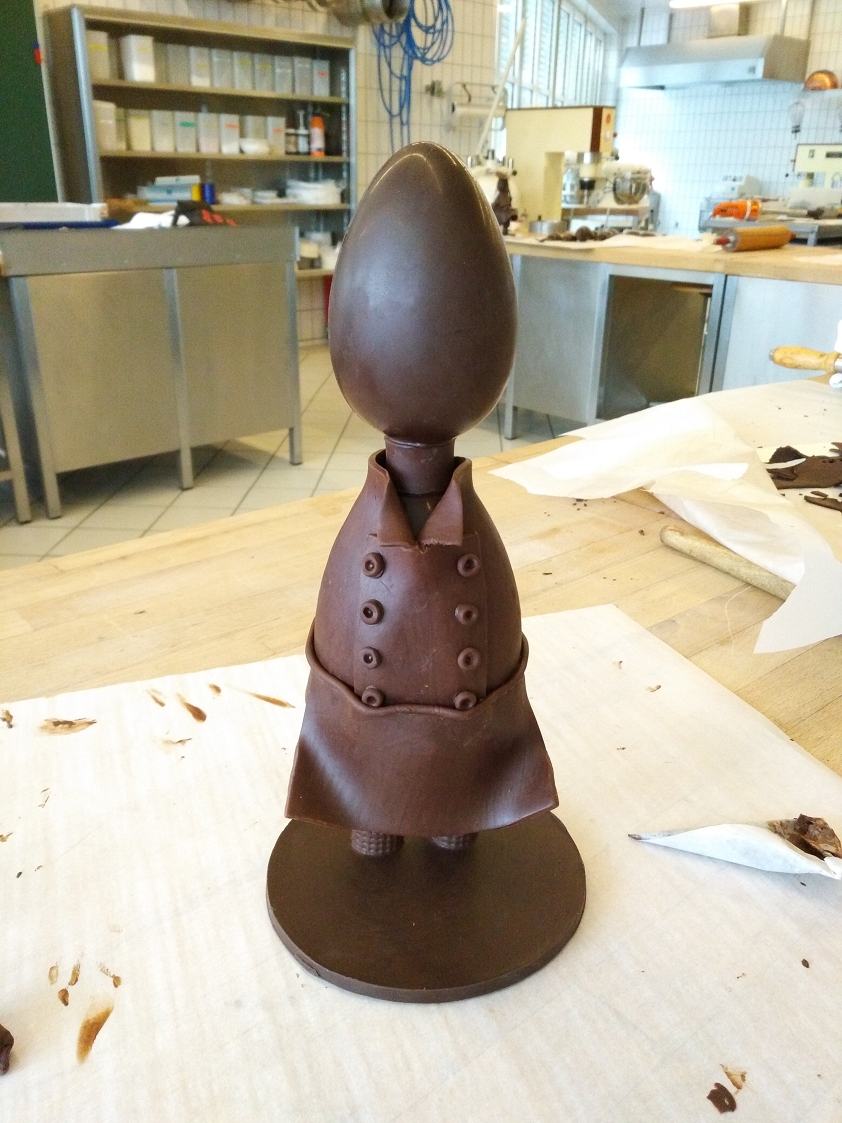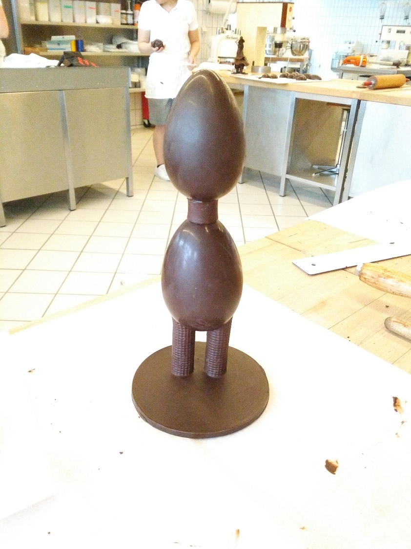 Als allererstes wurden der Kopf und der Körper gemacht, dazu verwendeten wir eine Eier-Form, die mit Kuvertüre gefüllt wurde.