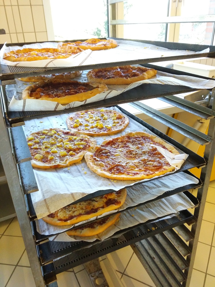 Die Pizzen sind schon ein kleines Ritual in der Schule. Jedes Mal wenn das Schulende naht, und in der Bäckerei schon der ganze Lehrplan durch ist, dürfen die Schüler ihre eigenen Pizzen machen. Die werden auch dann ganz gemütlich im Unterricht gegessen, meist gibt es auch noch eine Nachspeise dazu. Heuer waren das ein Topfen- und ein Apfelstrudel.